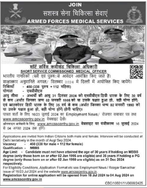AFMS SSC Medical Officer 450 (Male-338, Female- 112) MBBS/ PG Degree