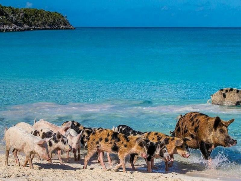 One of the most gorgeous beaches in the world, Pig Beach is an uninhabited island (or cay) located in Exuma, the Bahamas. The spot has become a most popular tourist destination in modern times. The spot also takes its unofficial name from the fact that it is populated by a colony of feral pigs which live on the island.