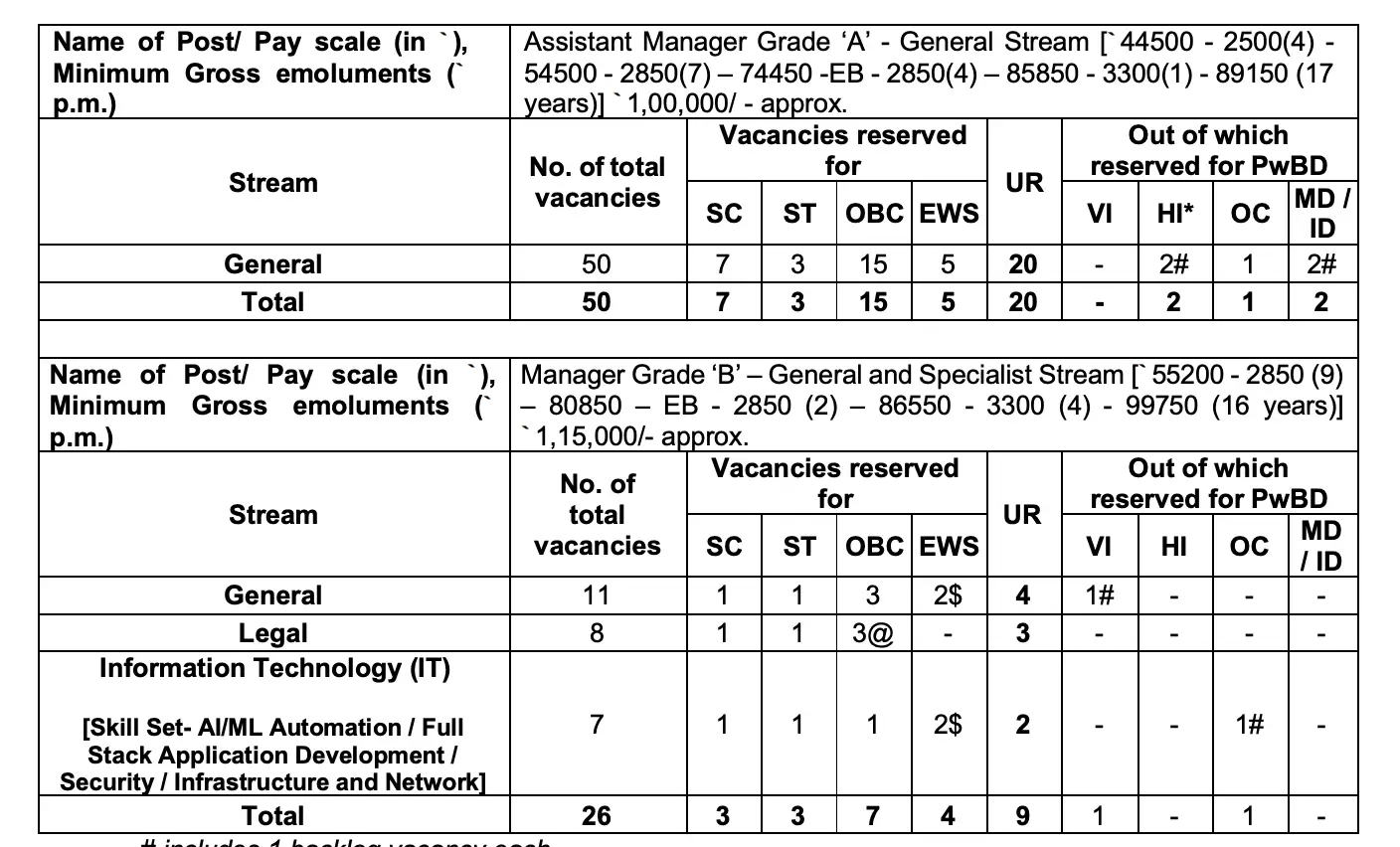 वर्ष 2025 के लिए SIDBI ने ग्रेड A और ग्रेड B पदों पर कुल मिलाकर 76 पद निकाले है. इसमें ग्रेड A (सामान्य स्ट्रीम) के लिए 50 पद और ग्रेड B के लिए 26 पद शामिल हैं. अधिक जानकारी के लिए निचे दी गयी तालिका देखें-