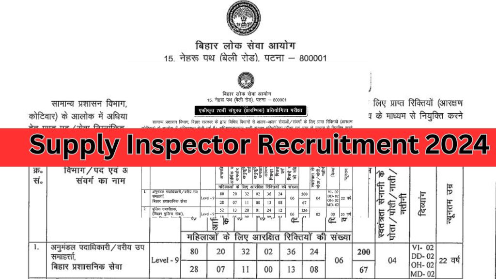 Supply Inspector Recruitment 2024: लोक सेवा आयोग द्वारा सेवा विभाग में सप्लाई इंस्पेक्टर के पदों का नोटीफिकेशन 23 सितम्बर जारी कर दिया गया है. इसमें 233 पदों पर भर्ती निकाली गयी है. इच्छुक व योग्य उम्मीदवार सप्लाई इंस्पेक्टर के लिए योग्य महिला और पुरुष उम्मीदवार ऑनलाइन आवेदन कर सकते हैं। इसकी आवेदन प्रक्रिया 28 सितम्बर से शुरू हो गयी जो 18 अक्टूबर 2024 तक चालू रहेगी. यदि आप इस भर्ती के लिए आवेदन करना चाहते है तो आपको इसके नोटिफिकेशन पीडीऍफ़ की जाँच कर लेनी चाहिए जिसको डाउनलोड करने का सीधा लिंक निचे दिया गया है. इस आर्टिकल में सप्लाई इंस्पेक्टर भर्ती से सम्बंधित सभी जानकारी को विस्तार से बताया गया है.जिसे आप अंत तक पूरा पढ़े.